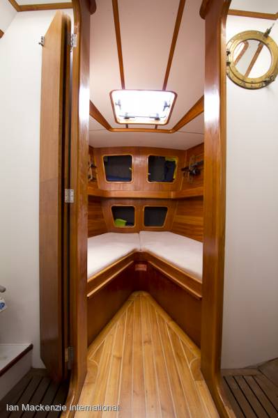 Double V-berth forward with infill and lee cloths.